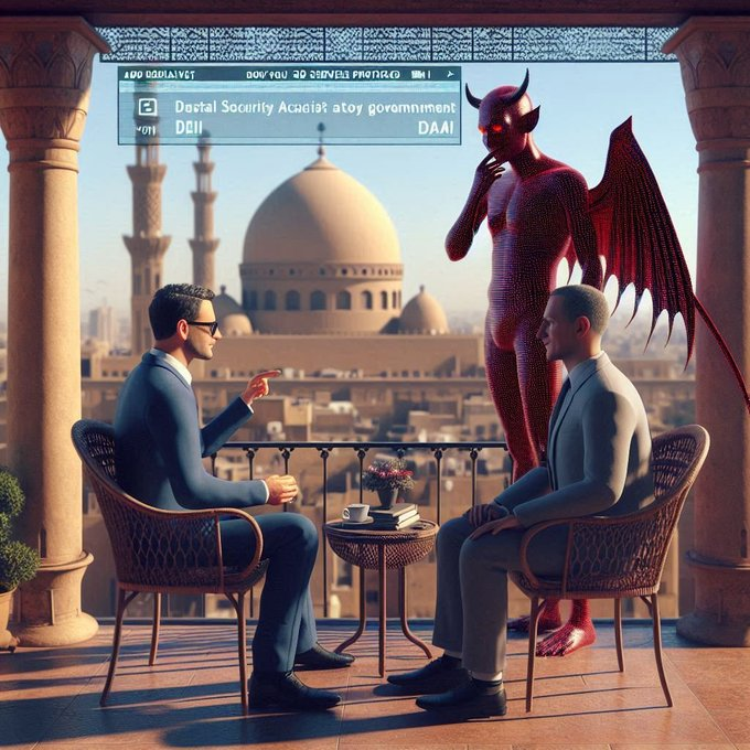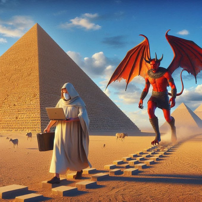 Analista de datos del Data Center de X es premiado por su contribución a la causa de X con un viaje a Egipto de 6 días con todos los gastos pagados, le sigue de cerca un demonio de La Segunda Jerarquía de Ha-Satán para informar a Ha-Satán. Imagen surrealista cortesía de Ha-Satán