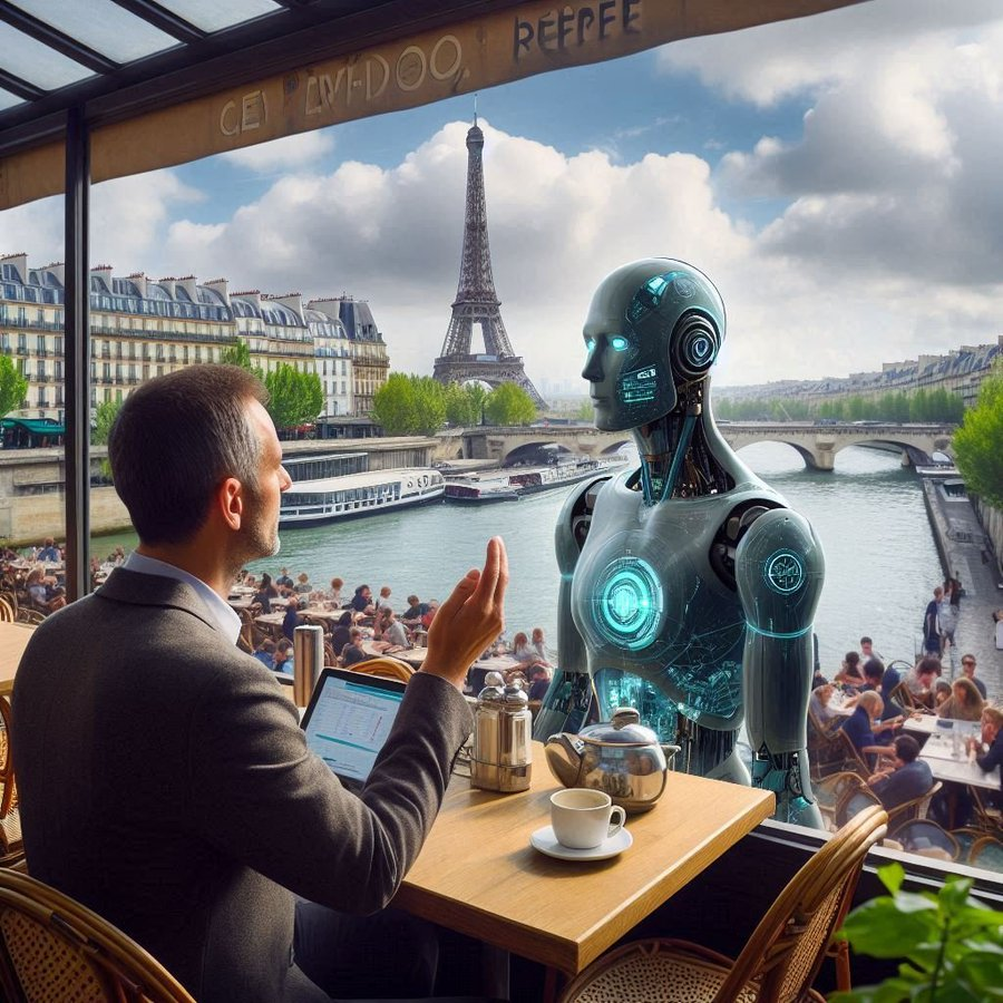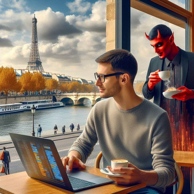 Un Data Engineer del Data Center de X está en una Cafetería de París con vistas al Rio Sena y a la Torre Eiffel, el data engineer está trabajando en un proyecto de IA. El Demonio «Serpent» de la primera jerarquía de Ha-Satán le sugiere que puede hacer en París.
