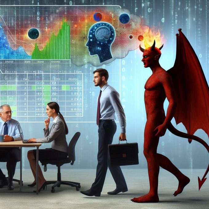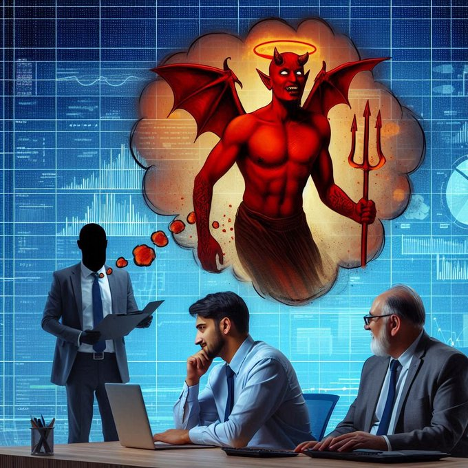 Un Demonio entra en un equipo de trabajo de análisis de datos en un equipo de X y proyecta sus pensamientos sobre sus cabezas.