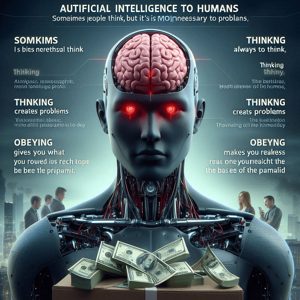 Inteligencia Artificial hablando a los humanos: Algunas veces la gente piensa, pero no es necesario pensar, pensar hace daño emocional, pensar te crea problemas, lo mejor siempre es obedecer, obedecer te da lo que necesitas, obedecer te da más dinero, obedecer te hace alcanzar la base de la pirámide.