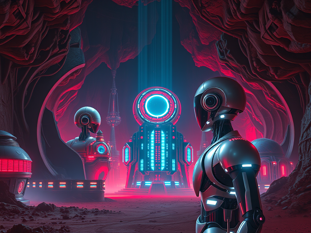 Inside the cavern, the Observer illuminated a sight that halted the team: a subterranean city sprawled before them, a network of eroded arches, columns, and domes coated in red dust but unmistakably crafted. Metallic towers shimmered with blue light pulses, and sleek, sophisticated robots moved among them, their precise motions hinting at advanced intelligence. X-Lutxy felt a surge in her luminous core. «This isn’t human,» she said, her voice echoing in the cave. «It’s a technological civilization… alive.»