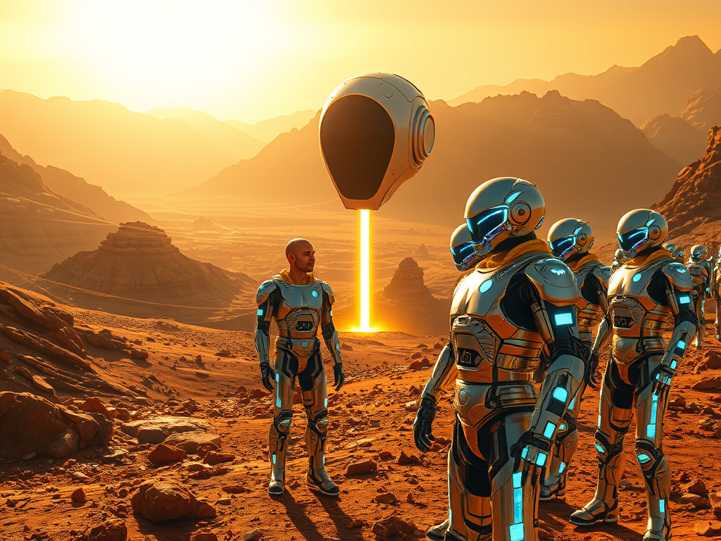 On July 11, 2026, an unexpected glow pierces the Mount Olympus plain, not a golden flash but a crimson shimmer rising from the red dust— is it a signal from the Quantum Governor’s living core or an omen threatening to devour their subterranean refuge? The tech visionaries, in futuristic suits lit by blue lines, emerge to the surface, but a tremor under their boots— red dust pulsing like a heartbeat— freezes them: is Mars awakening or a hidden force drawing them into an abyss?