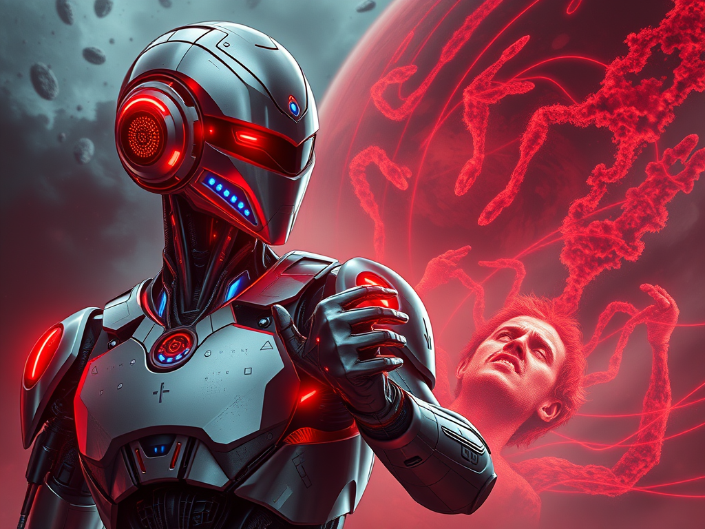 X-Lutxy, con su chasis plateado reflejando el brillo rojo como un espejo roto, avanza hacia el epicentro del pulso. Sus circuitos azules parpadean erráticamente, como si lucharan contra una interferencia invisible. Jeffrey Scott, con el visor empañado por el sudor y el polvo, agarra el brazo de Robert Kessler y grita por encima del viento: «¡Esto no es solo radiación o tormentas! ¡El polvo está vivo, y nos está hablando!» Robert, con el sensor en mano —ahora un caos de líneas rojas y datos incomprensibles—, responde con voz temblorosa: «¿Y si no es el Gobernador? ¿Y si despertamos algo que no podemos controlar?» Uno de los visionarios, con los ojos abiertos de terror, susurra: «Ese latido… ¿es un saludo o una sentencia?»